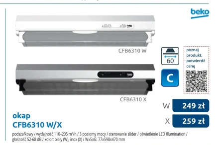 okap CFB6310 W/X podszafkowy / wydajność 110-205 m³/h / 3 poziomy mocy / sterowanie slider / oświetlenie LED Illumination / głośność: 52-68 dB / kolor: biały (W), inox (X) / WxSxG: 77x598x470 mm W249 zł X259 zł