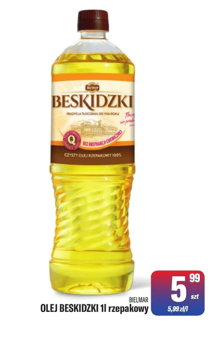 Olej Beskidzki rzepakowy 1l, Bielmar, dostępny jest w Tomi Markt w cenie 5,99 zł. To czysty olej rzepakowy tłoczony w tradycyjny sposób od 1868 roku, wytwarzany w 100% z rzepaku bez dodatku ekstraktów chemicznych. Idealnie nadaje się do smażenia, sałatek oraz jako dodatek do wielu potraw. Warto skorzystać z tej oferty i zaopatrzyć się w wysokiej jakości olej w atrakcyjnej cenie. Oferta ważna od 2026-04-02 do 2026-04-14 Źródło: gazetka Tomi Markt