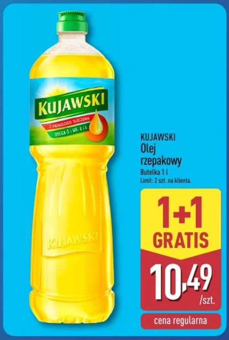 KUJAWSKI Olej rzepakowy Butelka 1 l Limit: 2 szt. na klienta. Idealny do smażenia, olej rzepakowy Kujawski doskonale sprawdzi się również w sałatkach jako zdrowy składnik dressingów. Dzięki wysokiej zawartości kwasów omega-3 wpływa korzystnie na serce i układ krążenia.