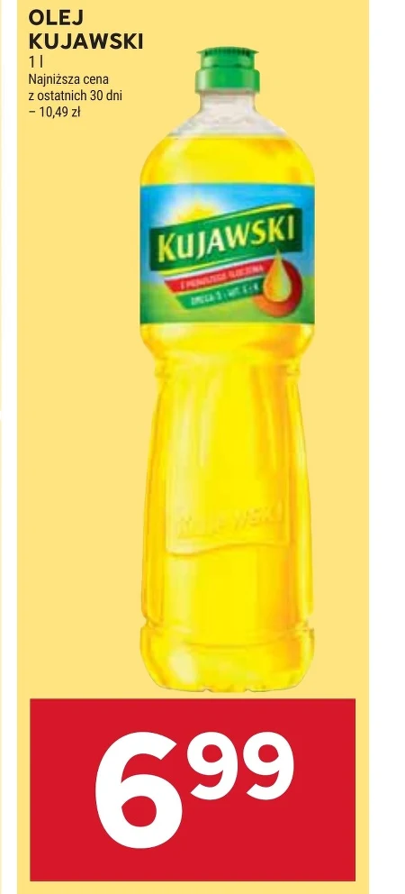 Olej Kujawski w Stokrotce dostępny teraz za 6,99 zł za butelkę 1 litra, najniższa cena w ostatnich 30 dni. To 33% taniej – idealna okazja, aby uzupełnić zapasy oleju do smażenia, pieczenia i przygotowywania sałatek. Promocja w Stokrotce pozwala zaoszczędzić, kupując sprawdzoną jakość w korzystnej cenie. Sprawdź aktualną gazetkę Stokrotki i skorzystaj z okazji.