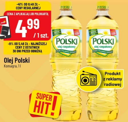 Olej Polski Komagra w butelce litrowej dostępny jest teraz w POLOmarket w cenie 4,99 zł. To obniżka o ponad czterdzieści jeden procent z ceny regularnej. Produkt jest objęty promocją przy zakupie z aplikacją lub kartą POLO. Olej ten świetnie sprawdzi się do smażenia, pieczenia oraz przygotowywania sałatek. To wyjątkowa okazja, aby zaopatrzyć się w wysokiej jakości olej w atrakcyjnej cenie.