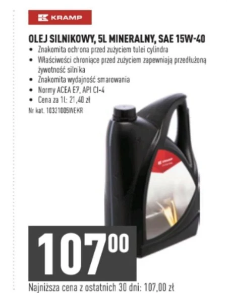OLEJ SILNIKOWY, 5L MINERALNY, SAE 15W-40 · Znakomita ochrona przed zużyciem tulei cylindra · Właściwości chroniące przed zużyciem zapewniają przedłużoną żywotność silnika · Znakomita wydajność smarowania · Normy ACEA E7, API CI-4 · Cena za 11: 21,40 zł Nr kat. 10321005WEKR