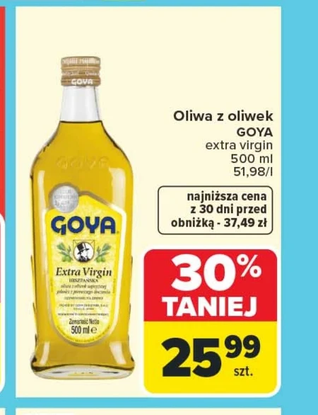 Oliwa z oliwek GOYA extra virgin 500 ml najniższa cena z 30 dni przed obniżką: 37,49 zł 30% TANIEJ 25,99 zł Oliwa z oliwek Goya extra virgin w butelce 500 ml dostępna jest w Carrefourze w obniżonej cenie. To doskonały wybór do przygotowywania sałatek, sosów, marynat oraz do smażenia w niskich temperaturach. Obecnie można ją kupić za 25,99 zł, co stanowi znaczącą obniżkę względem ceny z ostatnich 30 dni. Warto skorzystać z promocji i zaopatrzyć się w wysokiej jakości oliwę do codziennego gotowania.