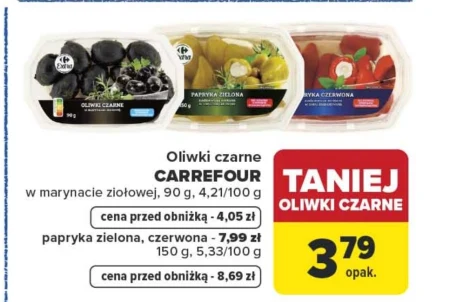 Oliwki czarne CARREFOUR w marynacie ziołowej, 90 g, 4,21/100 g cena przed obniżką - 4,05 zł papryka zielona, czerwona - 7,99 zł 150 g, 5,33/100 g cena przed obniżką - 8,69 zł
