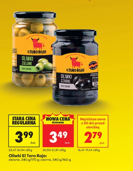 Oliwki El Toro Roja są dostępne w ofercie Biedronki w cenie 3,49 zł za opakowanie o wadze 340 g lub 170 g dla zielonych oraz 340 g lub 160 g dla czarnych, co daje 20,53-21,81 zł za kilogram. Doskonale sprawdzą się jako dodatek do sałatek, przekąska, składnik pizzy czy tapas. Ich wyrazisty smak wzbogaci wiele potraw, a praktyczne opakowanie pozwoli na ich długotrwałe przechowywanie. Regularna cena tych oliwek to 3,99 zł/kg, a najniższa cena w ciągu ostatnich 30 dni wynosiła 2,79 zł za opakowanie. Oferta ważna od 2026-04-10 do 2026-04-30 Źródło: gazetka Biedronka