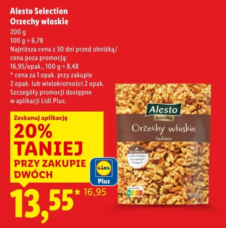 Alesto Selection Orzechy włoskie 200 g 100 g = 6,78 Najniższa cena z 30 dni przed obniżką/ cena poza promocją: 16,95/opak., 100 g = 8,48 * cena za 1 opak. przy zakupie 2 opak. lub wielokrotności 2 opak. Szczegóły promocji dostępne w aplikacji Lidl Plus.