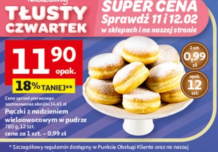 Cena sprzed pierwszego zastosowania obniżki 14,65 zł Pączki z nadzieniem wieloowocowym w pudrze 780 g, 12 szt. cena za 1 szt. - 0,99 zł