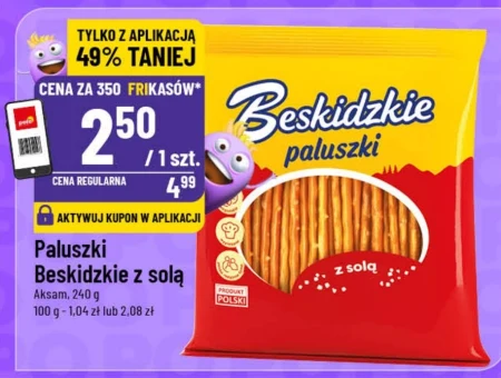 Paluszki Beskidzkie z solą Aksam o gramaturze 240 g dostępne są teraz w promocji w POLOmarket w cenie 2,08 zł, co oznacza prawie 50% zniżki względem ceny regularnej 4,99 zł. To idealna przekąska do chrupania podczas oglądania filmu lub jako dodatek do kanapki. Aby skorzystać z obniżki, należy aktywować kupon w aplikacji POLOmarket. Promocja obowiązuje do wyczerpania zapasów, więc warto sprawdzić dostępność w najbliższym sklepie i zaopatrzyć się w ulubione paluszki.