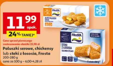 Paluszki serowe, chickensy lub steki z łososia, Frosta 200-280 g cena za 100 g - 6,00-4,28 zł