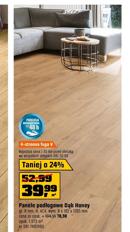 Panele podłogowe Dąb Honey dostępne są w ofercie OBI w cenie 78,90 za opakowanie, co oznacza obniżkę o 24% z poprzedniej ceny 104,55. Opakowanie zawiera 1,973 m² powierzchni użytkowej, a cena za metr kwadratowy wynosi teraz 39,99. Panele te charakteryzują się grubością 8 mm i klasą ścieralności AC4, dzięki czemu są odporne na uszkodzenia i idealnie sprawdzą się w intensywnie użytkowanych pomieszczeniach. Posiadają również 4-stronną fugę V, która nadaje im naturalny wygląd. To okazja, aby odświeżyć wnętrze trwałym i estetycznym rozwiązaniem. Oferta ważna od 2026-04-07 do 2026-04-21 Źródło: gazetka OBI