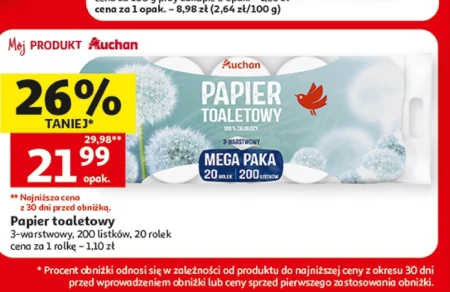 Papier toaletowy jest dostępny w ofercie Auchan w cenie 21,99 zł za opakowanie, co oznacza 26% taniej w porównaniu z ceną regularną 29,98 zł. Opakowanie zawiera 20 rolek papieru, każda z 200 listkami, a cena za pojedynczą rolkę wynosi 1,10 zł. Trójwarstwowy papier toaletowy zapewnia komfort i higienę w codziennym użytkowaniu. To najniższa cena z ostatnich 30 dni, co czyni tę ofertę szczególnie atrakcyjną dla osób poszukujących ekonomicznych rozwiązań. Warto skorzystać z tej okazji i zaopatrzyć się w niezbędny produkt w korzystnej cenie. Oferta ważna od 2026-04-09 do 2026-04-15 Źródło: gazetka Auchan