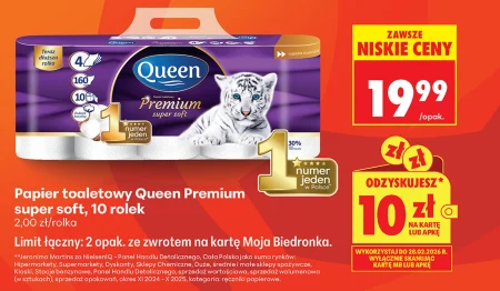 Papier toaletowy Queen Premium super soft, 10 rolek 2,00 zł/rolka Limit łączny: 2 opak. ze zwrotem na kartę Moja Biedronka.