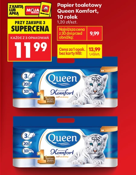 Papier toaletowy Queen Komfort, 10 rolek 1,20 zł/szt. Z KARTĄ LUB APKĄ MOJA PRZY ZAKUPIE 3 SUPERCENA KAŻDE 2/3 OPAKOWAŃ 11,99 Najniższa cena z 30 dni przed obniżką: 9,99 Cena za 1 opak. bez karty MB: 13,99 1,40 zł/szt. Queen Komfort to miękki i wydajny papier toaletowy, idealny do codziennego użytku w każdym domu. W Biedronce, przy zakupie trzech opakowań, można go nabyć w wyjątkowej cenie – każda rolka to zaledwie 1,20 zł, a korzystając z karty lub aplikacji Moja Biedronka, supercena wynosi 11,99 zł za dwa opakowania z trzecim w cenie regularnej. Gazetka Biedronka prezentuje tę ofertę jako oszczędny sposób na zaopatrzenie się w niezbędny artykuł higieniczny, który sprawdzi się w łazience, kuchni czy podczas podróży. Przygotuj się na wygodę i komfort z każdym użyciem, a dodatkowo zaoszczędź dzięki promocyjnej cenie w Biedronce.