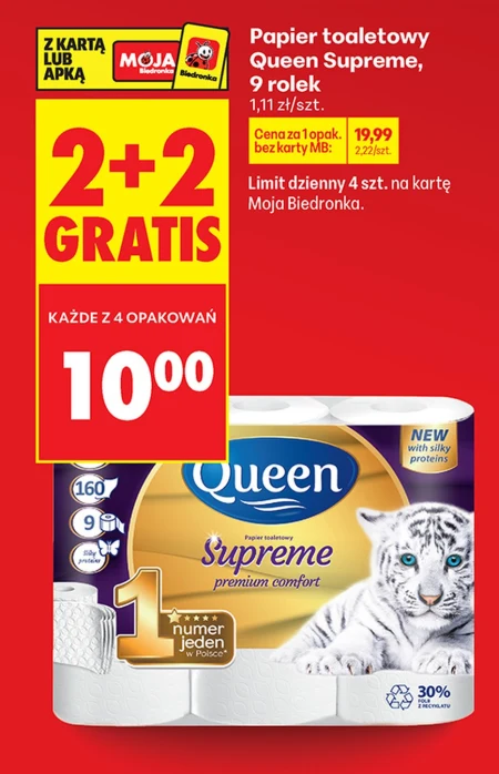 Papier toaletowy Queen Supreme, w zestawie 9 rolek, dostępny jest w ofercie Biedronka w cenie 19,99 zł za opakowanie, co daje 1,11 zł za rolkę. Przy zakupie dwóch opakowań, otrzymasz dwa kolejne gratis, a każde z czterech opakowań to tylko 10,00 zł. Ten niezawodny papier toaletowy to gwarancja komfortu i higieny w każdym gospodarstwie domowym, idealny do codziennego użytku. Skorzystaj z wyjątkowej okazji i zaopatrz się w zapas na dłużej, pamiętając o limicie dziennym - 4 sztuki na kartę Moja Biedronka.