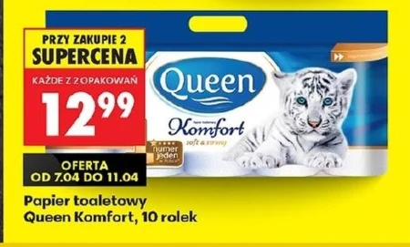 Papier toaletowy Queen Komfort 10 rolek występuje w ofercie Biedronka w supercenie 12,99 przy zakupie 2 opakowań. Produkt zapewnia codzienną higienę i odpowiedni poziom miękkości podczas użytkowania. Promocja obowiązuje w terminie od 7.04 do 11.04. To dobra okazja na zrobienie zapasów artykułów higienicznych w niższej cenie. Oferta ważna od 2026-04-07 do 2026-04-11 Źródło: gazetka Biedronka
