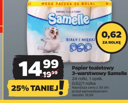 Papier toaletowy 3-warstwowy Samelle 24 rolki, 1 opak. 0,62/1 rolka Najniższa cena z 30 dni przed wprowadzeniem obniżki: 19,99