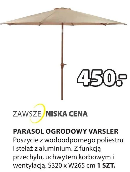PARASOL OGRODOWY VARSLER Poszycie z wodoodpornego poliestru i stelaż z aluminium. Z funkcją przechyłu, uchwytem korbowym i wentylacją. Ś320 x W265 cm 1 SZT.