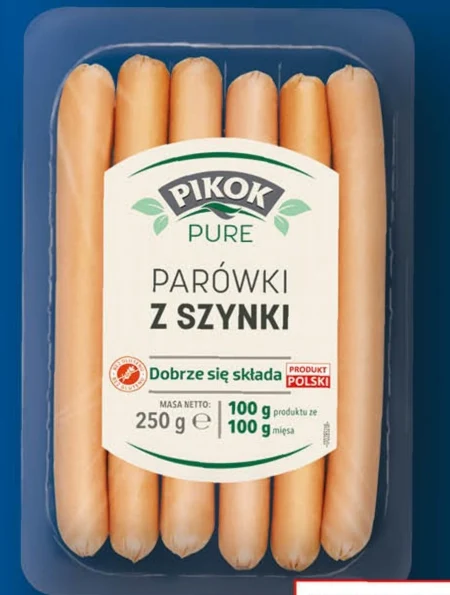 PIKOK PURE Parówki z szynki 250 g/1 opak. ** cena za 1 opak. przy zakupie 2 opak.: 4,19 zł/1 opak. (1,68 zł /100 g) Limit: 2 opak. na kupon. Każde kolejne opakowanie będzie sprzedawane w cenie przed obniżką. Szczegóły promocji dostępne w aplikcji Lidl Plus.