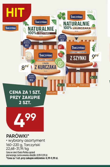 PARÓWKI* · wybrany asortyment 160-220 g, Tarczyński 22,68-31,19/kg Cena w sieci Chata Polska sprzed pierwszego zastosowania obniżki: 8,99-9,99 zł. *Cena za 1 szt. przy zakupie oddzielnie: 8,99-9,99 zł.