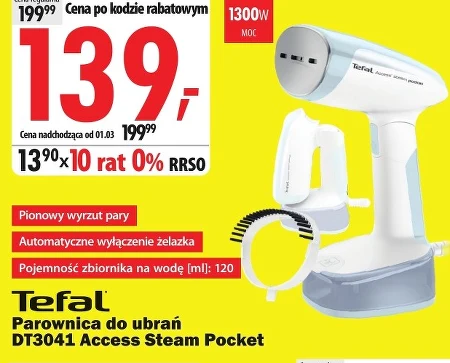 Parownica do ubrań DT3041 Access Steam Pocket Pionowy wyrzut pary Automatyczne wyłączenie żelazka Pojemność zbiornika na wodę [ml]: 120