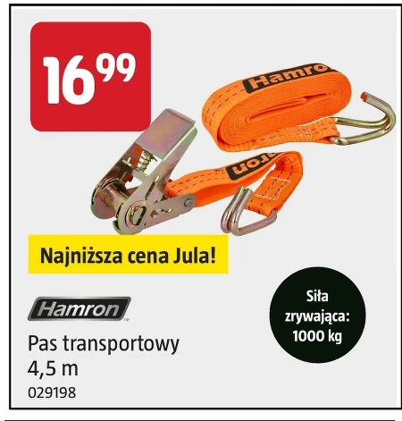 Pas transportowy Hamron o długości 4,5 metra z siłą zrywającą 1000 kg znajdziesz w najniższej cenie w Jula. Sprawdzi się do mocowania ładunków podczas transportu, zabezpieczając je przed przesuwaniem się. Aktualną ofertę i dostępność pasów transportowych Hamron warto sprawdzić w najnowszej gazetce Jula. Produkt o numerze 029198 dostępny jest w cenie 16,99.