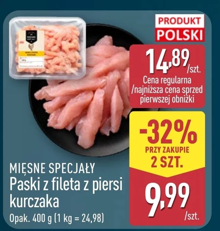 MIĘSNE SPECJALTY Paski z fileta z piersi kurczaka Opak. 400 g (1 kg = 24,98) 14,89/szt. Cena regularna/najniższa cena sprzed pierwszej obniżki -32% PRZY ZAKUPIE 2 SZT. 9,99/szt. Paski z fileta z piersi kurczaka z Aldi to szybki i prosty sposób na smaczny posiłek. Opakowanie zawiera 400 g delikatnego mięsa, idealnego do sałatek, stir-fry, tacos czy jako dodatek do ryżu. Obecnie dostępne w atrakcyjnej cenie przy zakupie dwóch opakowań – tylko 9,99 zł za sztukę, co stanowi znaczącą obniżkę względem ceny regularnej. Aldi zapewnia dostęp do sprawdzonych produktów w przystępnych cenach.