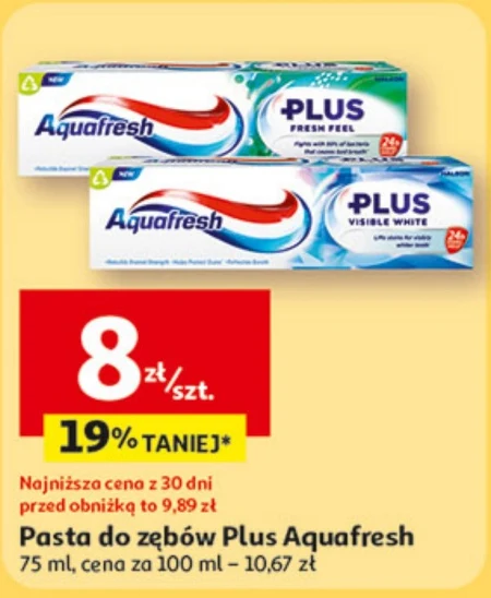 Pasta do zębów Plus Aquafresh o pojemności 75 ml jest dostępna w ofercie Auchan w cenie 8 zł za sztukę, co stanowi obniżkę o 19 procent. Ten produkt służy do codziennej higieny jamy ustnej i dbania o czystość zębów. Warto skorzystać z tej okazji, ponieważ najniższa cena z ostatnich trzydziestu dni przed obniżką była wyższa. Oferta ważna od 2026-04-23 do 2026-04-28 Źródło: gazetka Auchan
