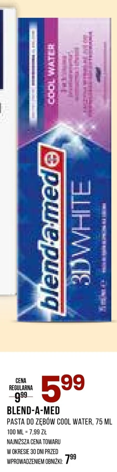 Blend-a-Med Pasta do zębów Cool Water w Drogeriach Natura dostępna jest teraz w cenie 5,99 zł za tubkę 75 ml. Promocja obniża cenę z 9,99 zł, a cena 100 ml wynosi 7,99 zł. To najniższa cena tego produktu w ciągu ostatnich 30 dni. Pastę Blend-a-Med Cool Water wykorzystasz do codziennej higieny jamy ustnej, zapewniając świeży oddech i skuteczną ochronę przed próchnicą.