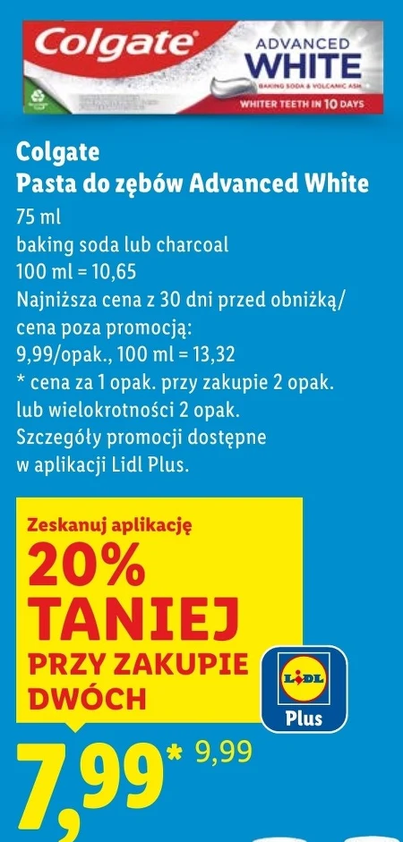 Colgate Pasta do zębów Advanced White 75 ml baking soda lub charcoal 100 ml = 10,65 Najniższa cena z 30 dni przed obniżką/ cena poza promocją: 9,99/opak., 100 ml = 13,32 * cena za 1 opak. przy zakupie 2 opak. lub wielokrotności 2 opak. Szczegóły promocji dostępne w aplikacji Lidl Plus.