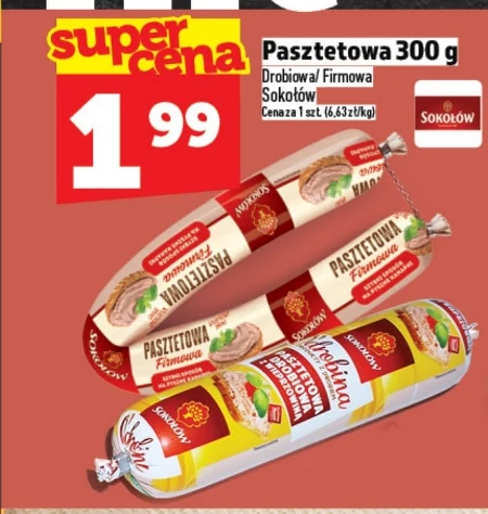 Pasztetowa 300 g, marki Sokółów, dostępna jest w ofercie Topaz w cenie 1,99 zł, co daje 6,63 zł za kilogram. Ten firmowy pasztet drobiowy doskonale sprawdzi się na śniadanie, kolację lub jako dodatek do kanapek. To idealna propozycja dla tych, którzy szukają smacznego i szybkiego rozwiązania podczas codziennych posiłków. Warto wykorzystać tę okazję i zaopatrzyć się w sprawdzony produkt w atrakcyjnej cenie. Oferta ważna od 2026-04-16 do 2026-04-22 Źródło: gazetka Topaz