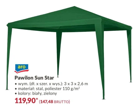 Pawilon ogrodowy Sun Star. Wymiary: (dł. x szer. x wys.): 3 x 3 x 2,6 m. Materiał: stal, poliester 110 g/m2. Kolory: biały, zielony. Cena netto - 119,90 zł.