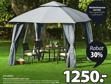 Pawilon ogrodowy Sankt Hans. Stalowa rama z wodoodpornym poszyciem poliestrowym. Waga 50 kg. Ze ściankami bocznymi i siatką na owady. S3 x D3 x W2,65 m.