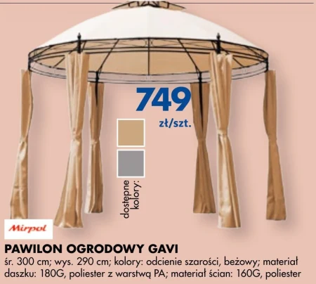 Pawilon ogrodowy Gavi, średnica 300 cm, wysokość 290 cm, kolory: odcienie szarości, beżowy, materiał daszku: 180G, poliester z warstwą PA, materiał ścian: 160G, poliester.
