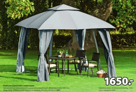 PAWILON OGRODOWY SANKT HANS Stalowa rama z wodoodpornym poszyciem poliestrowym. Wodoodporność: 600 mm. Waga 50 kg. Zawiera ścianki boczne i moskitierę. S3 x D3 x W2,65 m 1 SZT.
