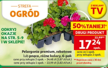 Pelargonia premium, rabatowa lub pnąca, w 6-paku, występuje w ofercie Auchan w cenie 34,48 zł przy zakupie dwóch opakowań, co daje 2,87 zł za sztukę, lub 22,99 zł za jedno opakowanie, czyli 3,83 zł za sztukę. Wykorzystaj 50% zniżki na drugi produkt i zapłać jedynie 17,24 zł za opakowanie. Pelargonie to doskonałe rośliny do ozdobienia balkonów, tarasów oraz ogrodów, a ich różnorodne kolory pozwolą stworzyć wyjątkową aranżację. To idealny wybór dla miłośników pięknych kwiatów, którzy chcą cieszyć się ich widokiem przez długi czas, a obecna oferta to świetna okazja, aby zaopatrzyć się w te popularne rośliny w atrakcyjnej cenie. Oferta ważna od 2026-04-23 do 2026-04-28 Źródło: gazetka Auchan