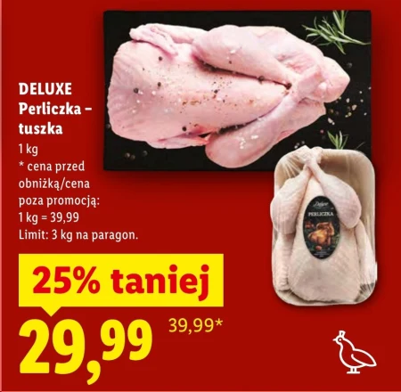 DELUXE Perliczka - tuszka 1 kg * cena przed obniżką/cena poza promocją: 1 kg = 39,99 Limit: 3 kg na paragon. Perliczka to doskonały wybór do przygotowania wykwintnych dań mięsnych, takich jak pieczone udka czy soczyste roladki. Dzięki swojemu delikatnemu smakowi oraz bogatej zawartości białka, tuszka perliczki stanowi idealny składnik zdrowych i smacznych posiłków dla miłośników kulinariów.