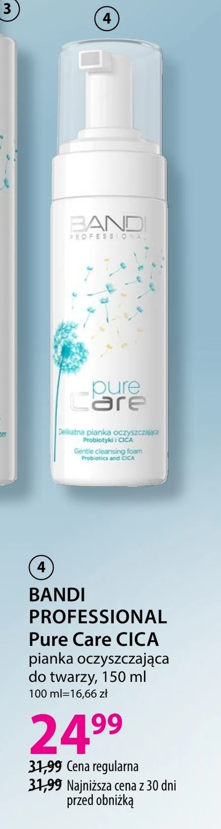BANDI Pure Care CICA pianka oczyszczająca do twarzy o pojemności 150 ml dostępna jest w Hebe w cenie 24,99 zł zamiast 31,99 zł. Aktualna cena to najniższa od 30 dni, co oznacza oszczędność 7 zł. Pianka ta skutecznie usuwa zanieczyszczenia i pomaga utrzymać skórę w dobrej kondycji. Produkt można wykorzystać do codziennego oczyszczania twarzy.