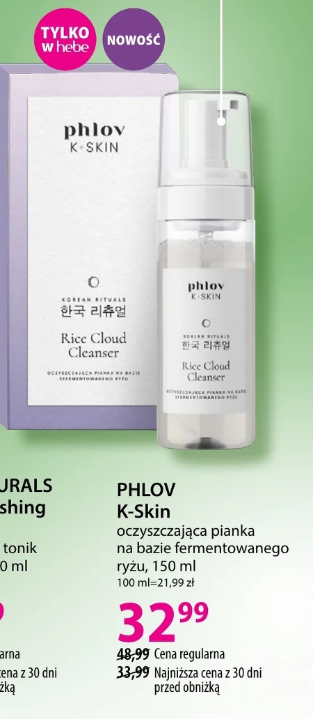 PHLOV K-Skin oczyszczająca pianka na bazie fermentowanego ryżu w Hebe kosztuje teraz 32,99 zł za 150 ml, co daje 21,99 zł za 100 ml. Promocja obniża cenę z 48,99 zł, a najniższa cena z ostatnich 30 dni wynosiła 33,99 zł. Piankę wykorzystasz do codziennego, delikatnego oczyszczania skóry twarzy.