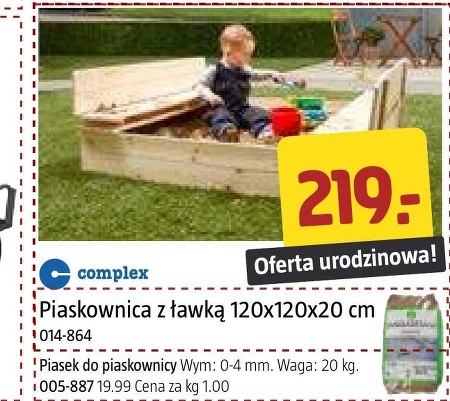 Piaskownica z ławką 120x120x20 cm 014-864 Piasek do piaskownicy Wym: 0-4 mm. Waga: 20 kg. 005-887 19.99 Cena za kg 1.00