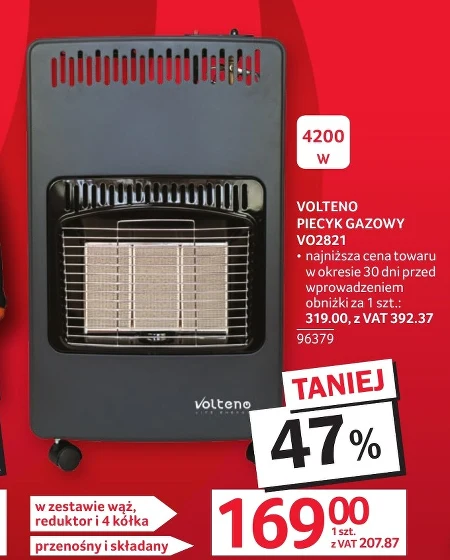 VOLTENO PIECZYK GAZOWY VO2821 - najniższa cena towaru w okresie 30 dni przed wprowadzeniem obniżki za 1 szt.: 319,00, z VAT 392,37 TANIEJ 47% 169,00 1 szt. z VAT 207,87 w zestawie wąż, reduktor i 4 kółka przenośny i składany Przenośny piecyk gazowy VOLTENO VO2821 dostępny jest teraz w Selgros Cash&Carry w obniżonej cenie 169,00 zł z VAT – 207,87 zł. W zestawie znajduje się wąż, reduktor oraz cztery kółka, co zapewnia łatwość użytkowania i mobilność. Idealny do ogrzewania pomieszczeń, piecyk jest składany, co ułatwia jego przechowywanie, a aktualna cena jest najniższa od 30 dni, obniżona o 47% względem poprzedniej. Sprawdź najnowszą gazetkę promocyjną Selgros Cash&Carry, aby nie przegapić tej okazji.