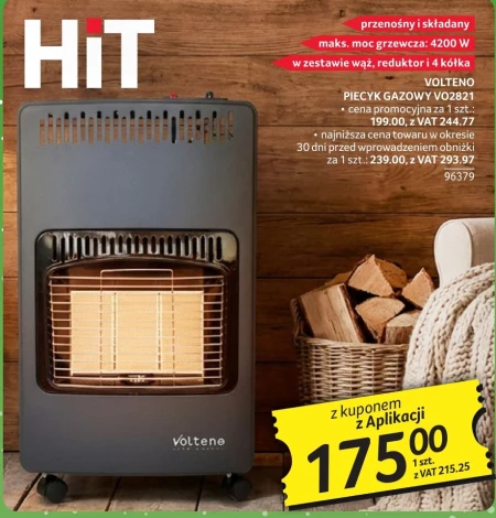 przenośny i składany maks, moc grzewcza: 4200 W w zestawie wąż, reduktor i 4 kółka VOLTENO PIECYK GAZOWY VO2821 · cena promocyjna za 1 szt .: 199.00, z VAT 244.77 · najniższa cena towaru w okresie 30 dni przed wprowadzeniem obniżki za 1 szt .: 239.00, z VAT 293.97 95379