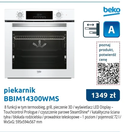 piekarnik BBIM14300WMS 1349 zł 8 funkcji w tym termoobieg, grill, pieczenie 3D / wyświetlacz LED Display - Touchcontrol Prologue / czyszczenie parowe SteamShine® / katalityczna ściana tylna / blokada rodzicielska / prowadnice teleskopowe – 1 poziom / pojemność 72 l / WxSxG: 595x594x567 mm