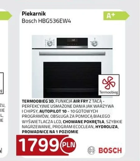 Piekarnik Bosch HBG536EW4 TERMOOBIEG 3D, FUNKCJA AIR FRY Z TACĄ - PERFEKCYJNIE USMAŻONE DANIA JAK WARZYWA I CHIPSY, AUTOPILOT 10 - 10 GOTOWYCH PROGRAMÓW, OBSŁUGA ZA POMOCĄ BIAŁEGO WYŚWIETLACZA LCD, CHOWANE POKRĘTŁA, SZYBKIE NAGRZEWANIE, PROGRAM ECOCLEAN, HYDROLIZA, PROWADNICE NA 1 POZIOMIE