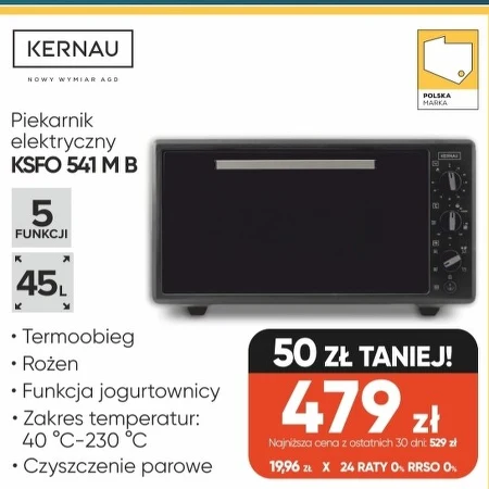 Piekarnik elektryczny KSFO 541 M B 5 FUNKCJI 45L • Termoobieg • Rożen • Funkcja jogurtownicy • Zakres temperatur: 40 °C-230 °C • Czyszczenie parowe