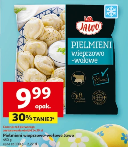 Pierogi wieprzowo-wołowe Jawo 450 g cena za 100g - 2,22 zł Wyśmienite pierogi z mięsem Jawo to idealny pomysł na szybki i sycący obiad, szczególnie gdy brakuje czasu na gotowanie. Te tradycyjne pierogi wieprzowo-wołowe stanowią doskonałą bazę do stworzenia pożywnych dań, świetnie smakują zarówno odsmażane, jak i gotowane, a także doskonale komponują się z różnymi sosami i dodatkami, stanowiąc klasykę polskiej kuchni. Przygotuj pyszne danie z mięsnym nadzieniem, idealne na rodzinny obiad lub spotkanie z przyjaciółmi, wybierając wysokiej jakości pierogi Jawo.