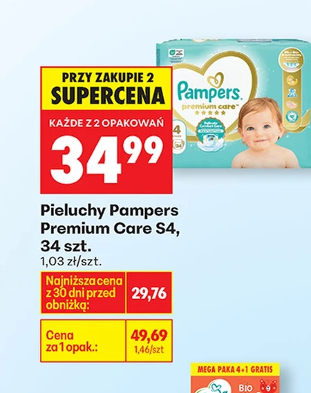Pieluchy Premium Care S4, opakowanie 34 sztuk, dostępne są w ofercie Biedronka w cenie 49,69 zł, co daje 1,46 zł za sztukę. Przy zakupie dwóch opakowań cena każdego spada do 34,99 zł. Pieluchy te zapewniają delikatną pielęgnację skóry dziecka, oferując komfort i suchość przez długi czas. Obecnie jest to jedna z najniższych cen, w ciągu ostatnich 30 dni produkt kosztował 29,76 zł, więc warto rozważyć zakup, gdy cena jest tak korzystna.