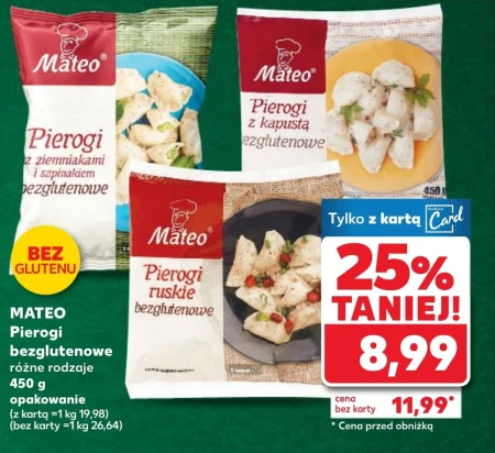 MATEO Pierogi bezglutenowe różne rodzaje 450 g opakowanie (z kartą =1 kg 19,98) (bez karty =1 kg 26,64)