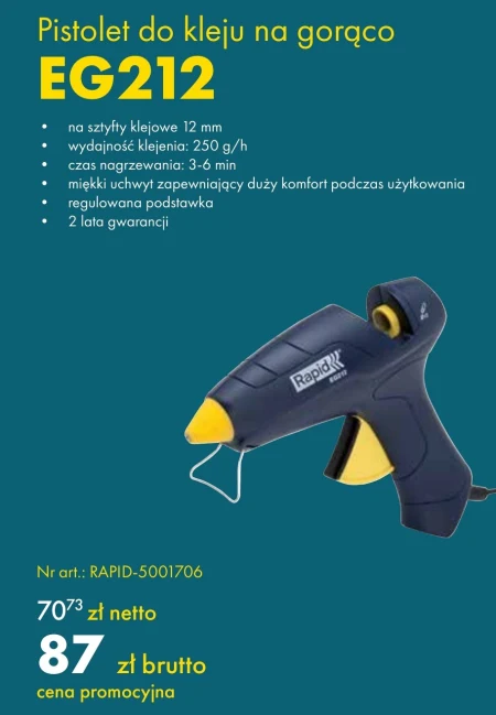 Pistolet do kleju na gorąco EG212 na sztyfty klejowe 12 mm wydajność klejenia: 250 g/h czas nagrzewania: 3-6 min miękki uchwyt zapewniający duży komfort podczas użytkowania regulowana podstawka 2 lata gwarancji