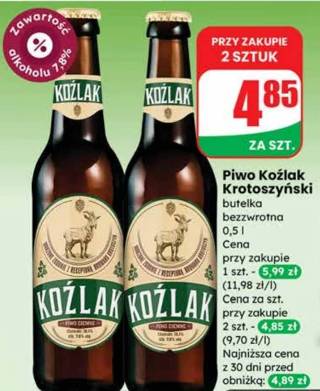 Piwo Koźlak Krotoszyński butelka bezzwrotna 0,5 l Cena przy zakupie 1 szt. - 5,99 zł (11,98 zł/l) Cena za szt. przy zakupie 2 szt. - 4,85 zł (9,70 zł/l) Najniższa cena z 30 dni przed obniżką: 4,89 zł