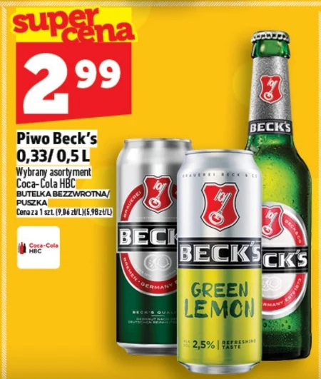 Piwo Beck's jest dostępne w ofercie Topaz w cenie 2,99 zł za butelkę bez zwrotu lub puszkę o pojemności 0,33 lub 0,5 litra. Wybrany asortyment piwa pochodzi od Coca-Cola HBC i oferuje orzeźwiający smak idealny na każdą okazję. To propozycja dla osób, które cenią sobie klasyczne piwo w wygodnym opakowaniu. Warto skorzystać z tej okazji, aby zaopatrzyć się w ulubiony napój w korzystnej cenie. Oferta ważna od 2026-04-16 do 2026-04-22 Źródło: gazetka Topaz